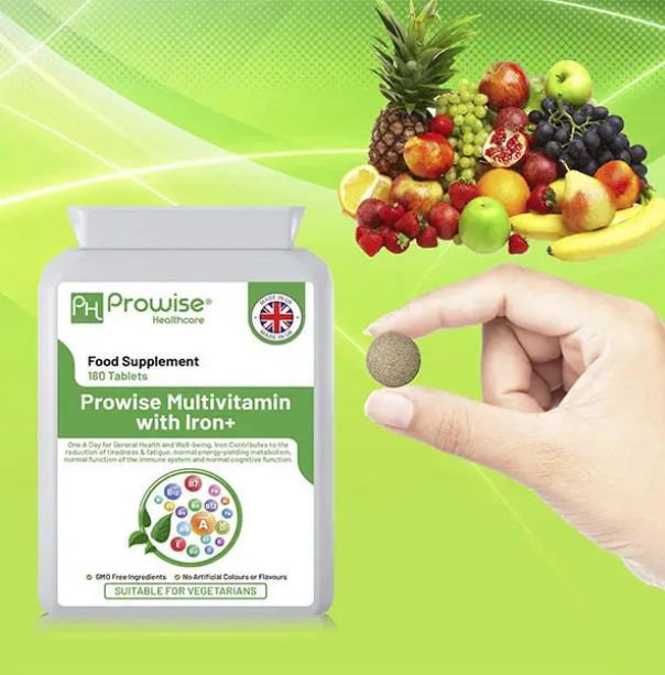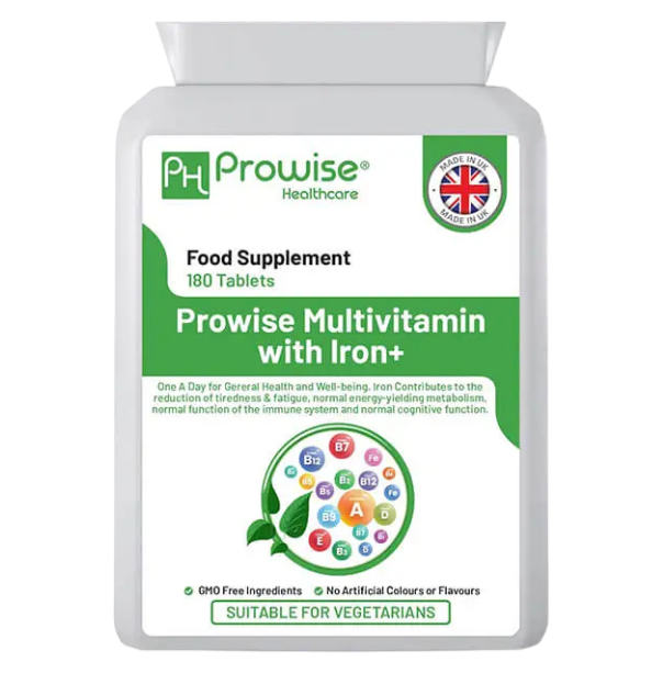 Prowise multivitamin tablets for men women are a specially formulated blend of essential vitamins and iron in a convenient daily tablet to help you meet your nutritional needs and support your everyday health and wellbeing. This comprehensive multivitamin supports bone, teeth, and muscle health helps combat tiredness and fatigue, maintains normal red blood cell formation, boosts the immune system, and more. Best multivitamin tablets with iron can be taken on a daily basis to provide a wide range of benefits from immune health to support your energy levels. Prowise Multivitamin with iron tablets is manufactured in the UK under the GMP code of practice to guarantee quality and safety. Benefits Of Multivitamin Tablets For Men Women: Encourages healthy hair, skin, and nails. Vitamin C D supports the immune system. Supports healthy energy levels. Provides daily health support. Supports energy, bones, teeth, and muscles.